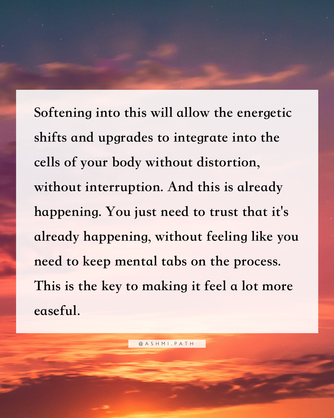 Softening into this will allow the energetic shifts and upgrades to integrate into the cells of your body without distortion, without interruption. And this is already happening. You just need to trust that it's already happening, without feeling like you need to keep mental tabs on the process. This is the key to making it feel a lot more easeful.