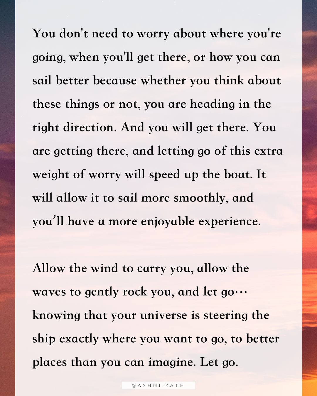 You don't need to worry about where you're going, when you'll get there, or how you can sail better because whether you think about these things or not, you are heading in the right direction. And you will get there. You are getting there, and letting go of this extra weight of worry will speed up the boat. It will allow it to sail more smoothly, and you’ll have a more enjoyable experience.