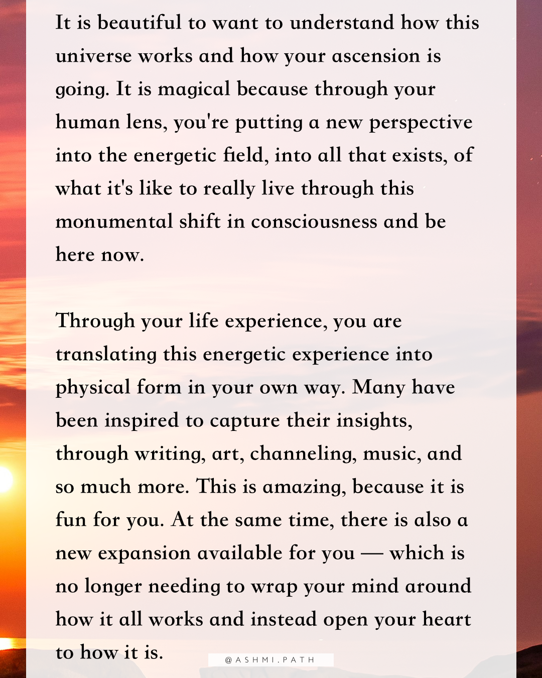 It is beautiful to want to understand how this universe works and how your ascension is going. It is magical because through your human lens, you're putting a new perspective into the energetic field, into all that exists, of what it's like to really live through this monumental shift in consciousness and be here now.