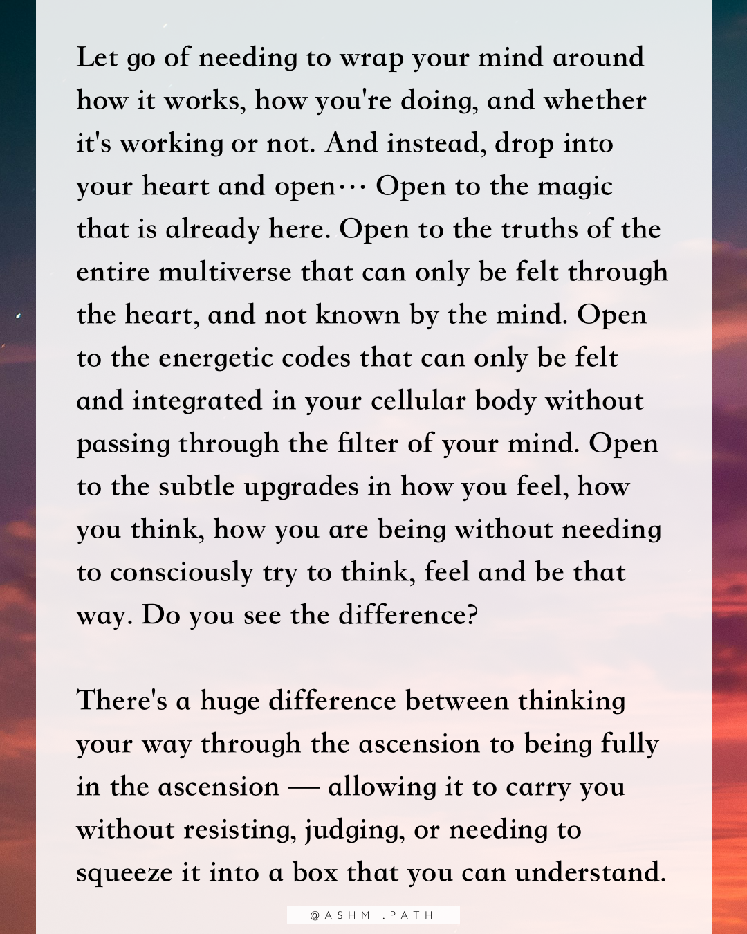 Let go of needing to wrap your mind around how it works, how you're doing, and whether it's working or not. And instead, drop into your heart and open… Open to the magic that is already here. Open to the truths of the entire multiverse that can only be felt through the heart, and not known by the mind. Open to the energetic codes that can only be felt and integrated in your cellular body without passing through the filter of your mind. Open to the subtle upgrades in how you feel, how you think, how you are being without needing to consciously try to think, feel and be that way. Do you see the difference?