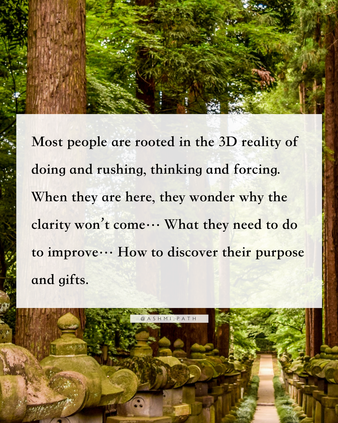 Most people are rooted in the 3D reality of doing and rushing, thinking and forcing. When they are here, they wonder why the clarity won’t come… What they need to do to improve… How to discover their purpose and gifts.