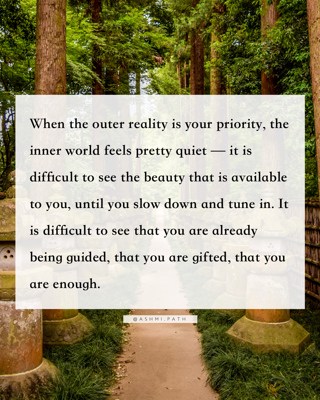 When the outer reality is your priority, the inner world feels pretty quiet — it is difficult to see the beauty that is available to you, until you slow down and tune in. It is difficult to see that you are already being guided, that you are gifted, that you are enough.