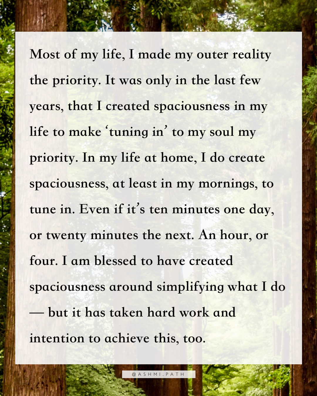 Most of my life, I made my outer reality the priority. It was only in the last few years, that I created spaciousness in my life to make ‘tuning in’ to my soul my priority. In my life at home, I do create spaciousness, at least in my mornings, to tune in. Even if it’s ten minutes one day, or twenty minutes the next. An hour, or four. I am blessed to have created spaciousness around simplifying what I do — but it has taken hard work and intention to achieve this, too.