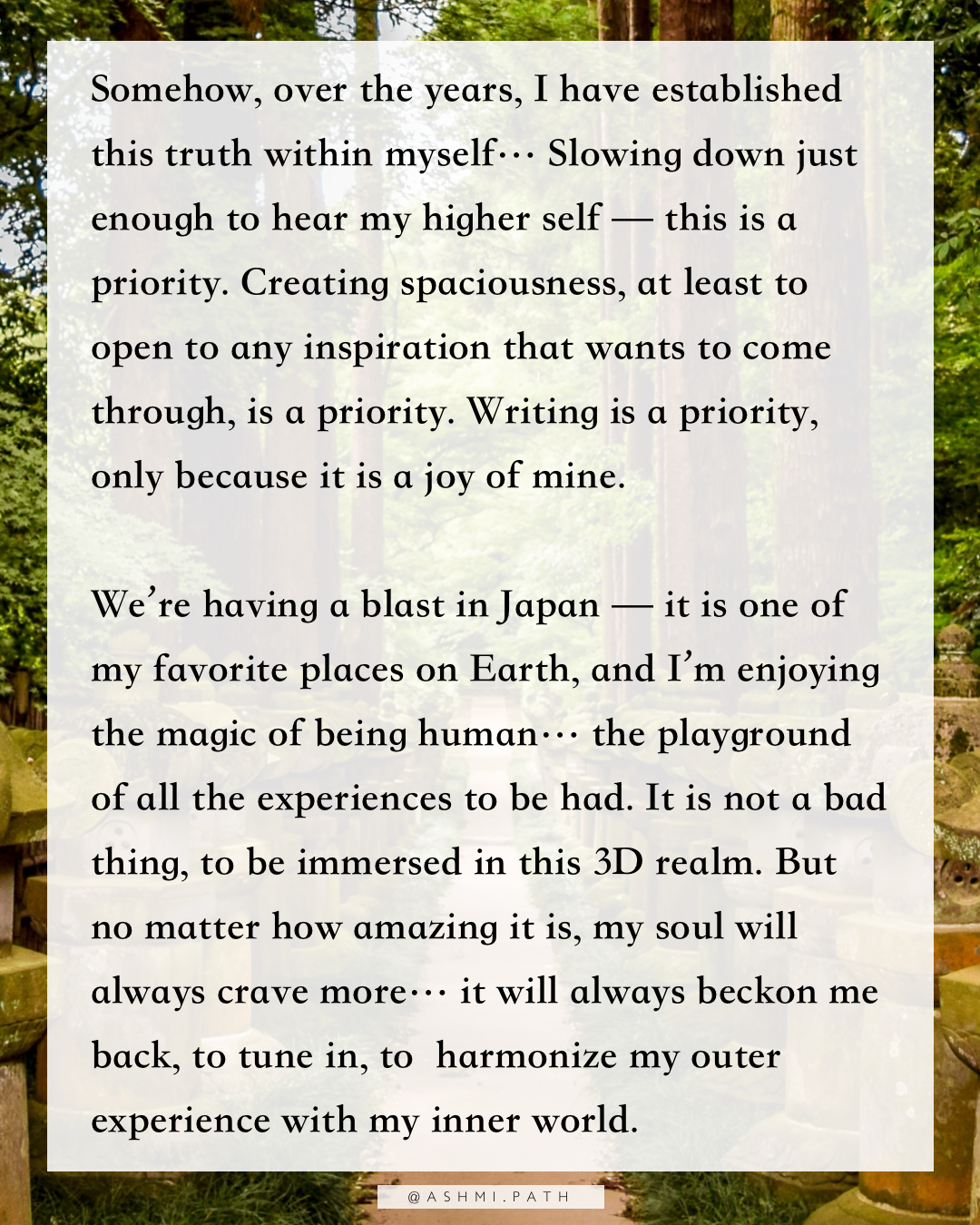 We’re having a blast in Japan — it is one of my favorite places on Earth, and I’m enjoying the magic of being human… the playground of all the experiences to be had. It is not a bad thing, to be immersed in this 3D realm. But no matter how amazing it is, my soul will always crave more… it will always beckon me back, to tune in, to harmonize my outer experience with my inner world.