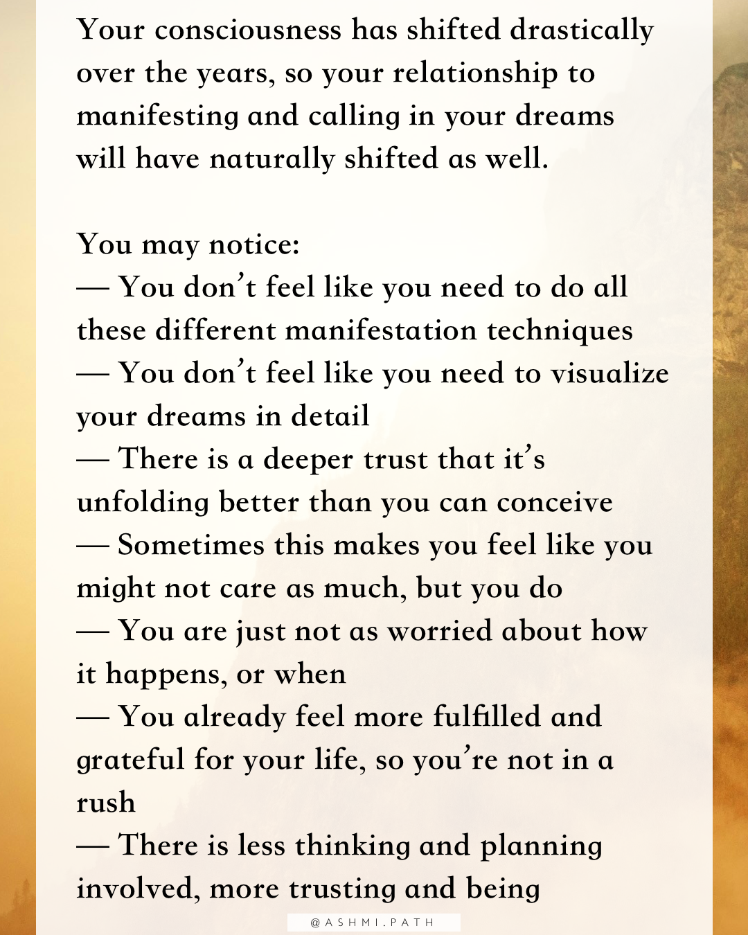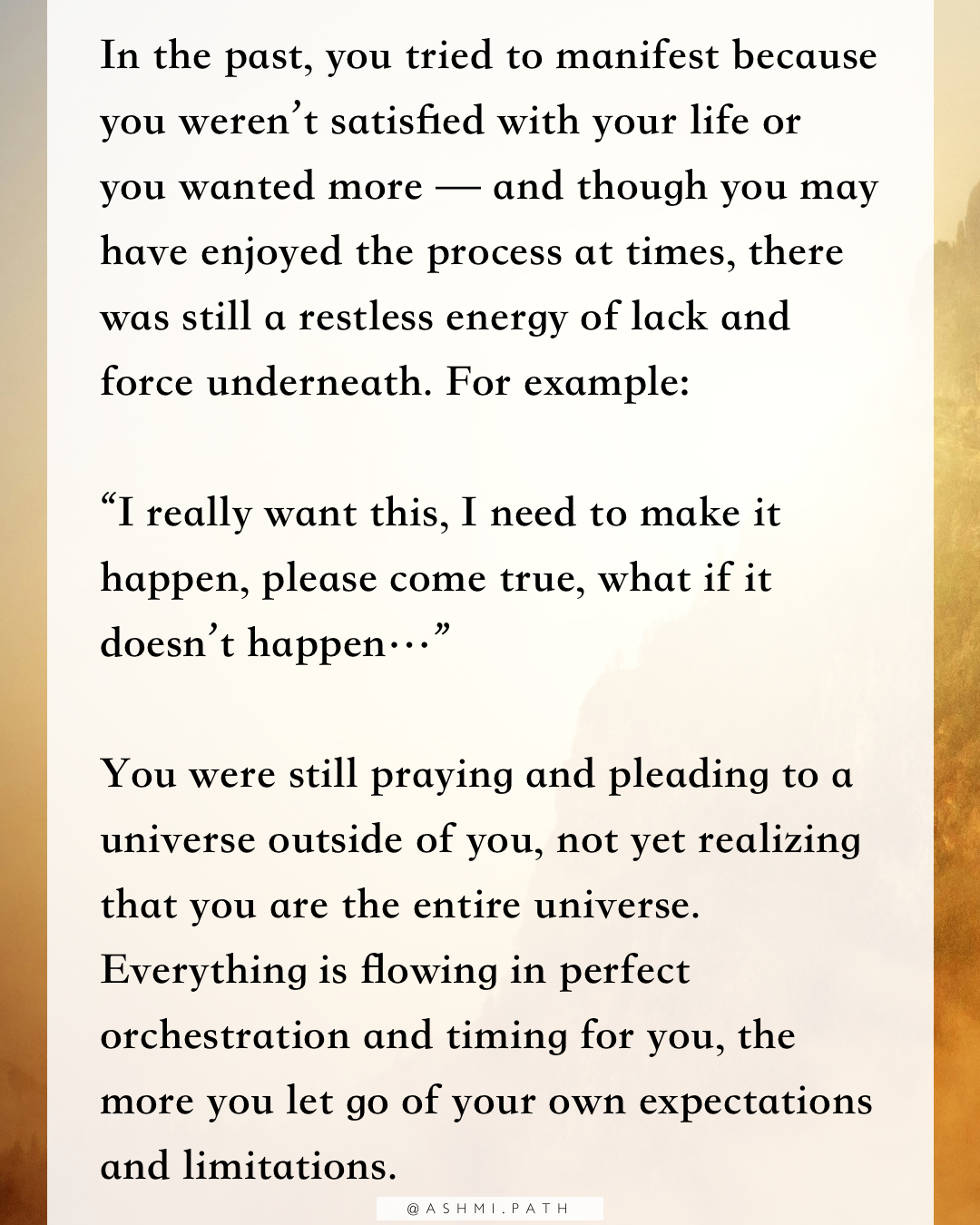 In the past, you tried to manifest because you weren’t satisfied with your life or you wanted more — and though you may have enjoyed the process at times, there was still a restless energy of lack and force underneath. For example: