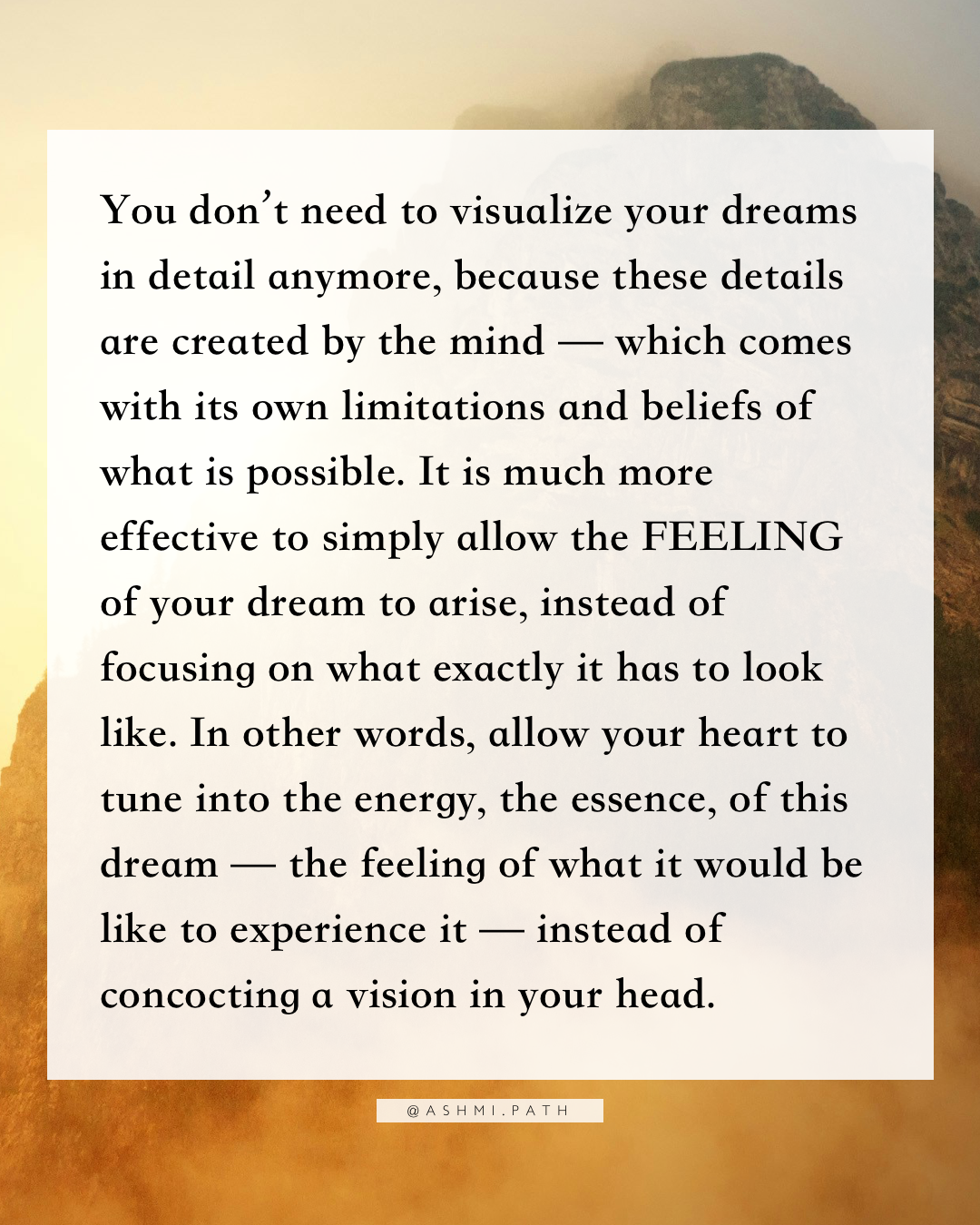 You don’t need to visualize your dreams in detail anymore, because these details are created by the mind — which comes with its own limitations and beliefs of what is possible. It is much more effective to simply allow the FEELING of your dream to arise, instead of focusing on what exactly it has to look like. In other words, allow your heart to tune into the energy, the essence, of this dream — the feeling of what it would be like to experience it — instead of concocting a vision in your head.