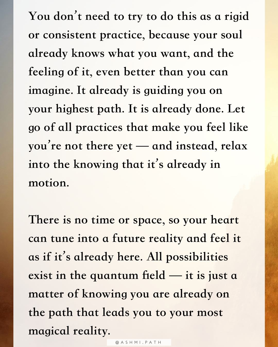 There is no time or space, so your heart can tune into a future reality and feel it as if it’s already here. All possibilities exist in the quantum field — it is just a matter of knowing you are already on the path that leads you to your most magical reality.