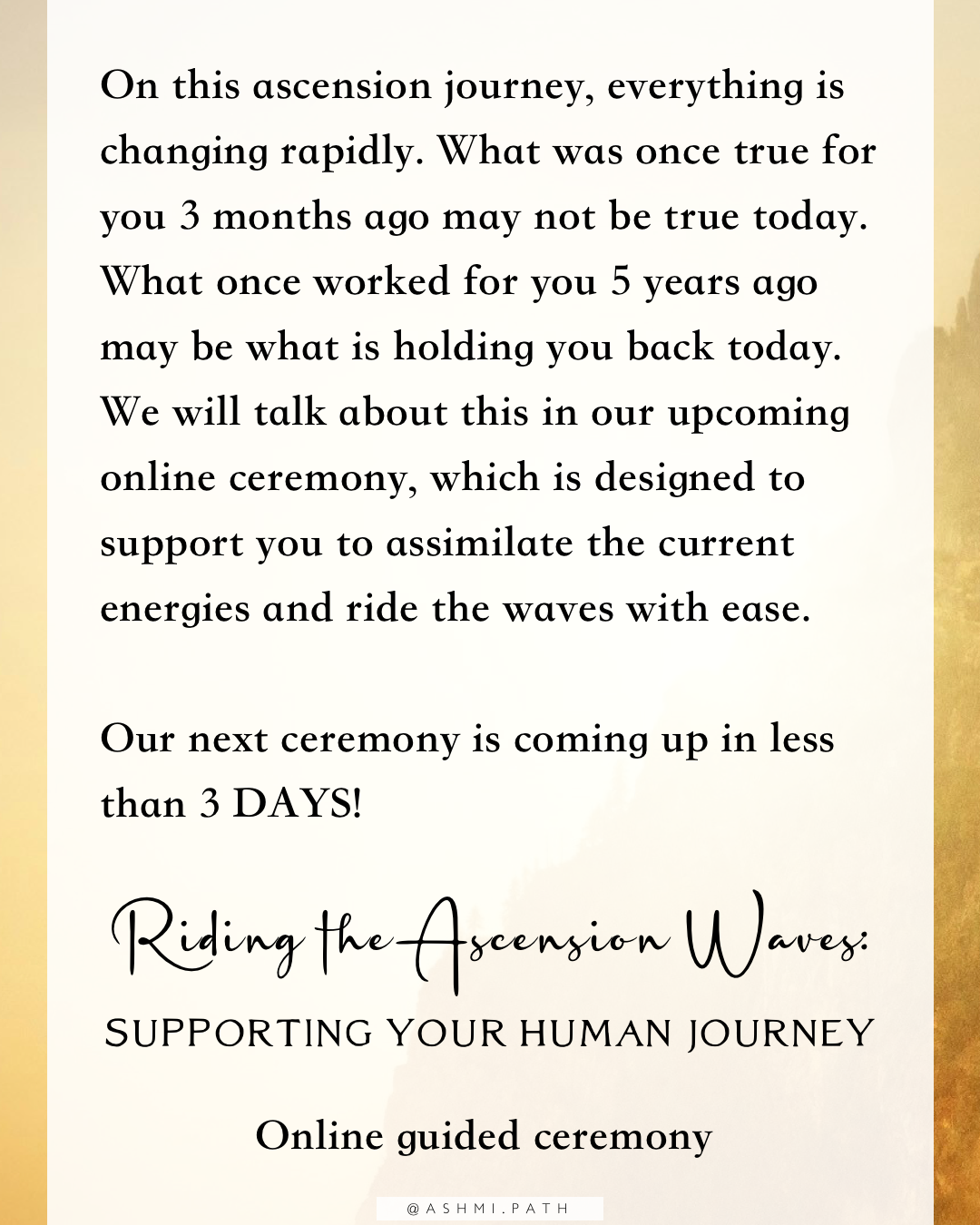 On this ascension journey, everything is changing rapidly. What was once true for you 3 months ago may not be true today. What once worked for you 5 years ago may be what is holding you back today. We will talk about this in our upcoming online ceremony, which is designed to support you to assimilate the current energies and ride the waves with ease.