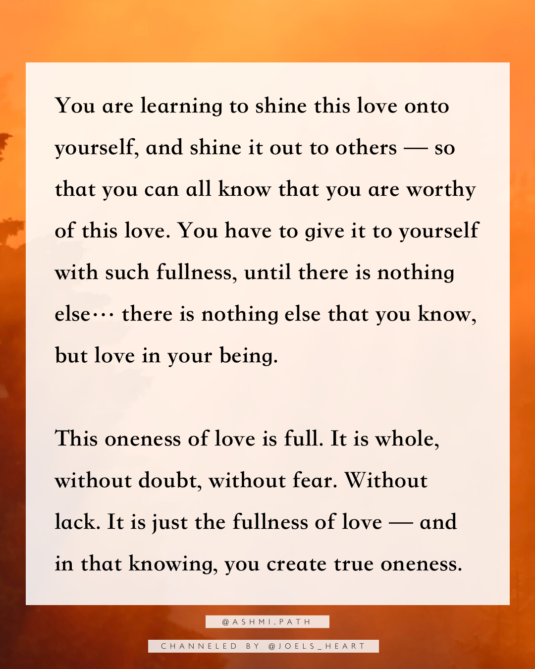 You are learning to shine this love onto yourself, and shine it out to others — so that you can all know that you are worthy of this love. You have to give it to yourself with such fullness, until there is nothing else… there is nothing else that you know, but love in your being.