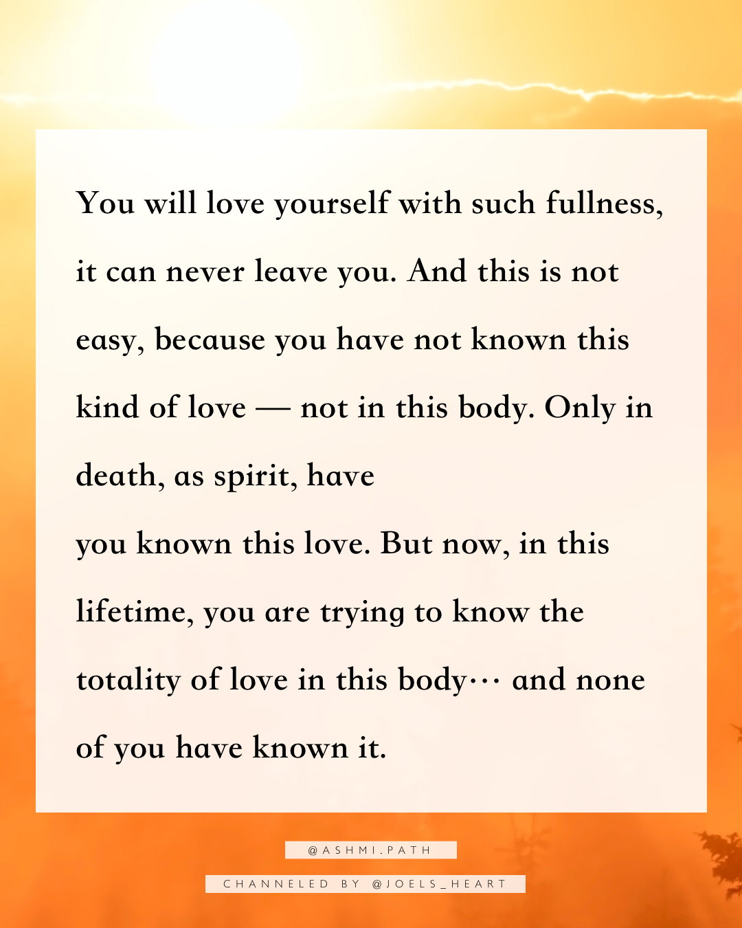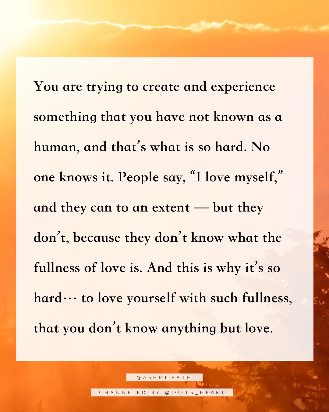 You are trying to create and experience something that you have not known as a human, and that’s what is so hard. No one knows it. People say, “I love myself,” and they can to an extent — but they don’t because they don’t know what the fullness of love is. And this is why it’s so hard… to love yourself with such fullness, that you don’t know anything but love.