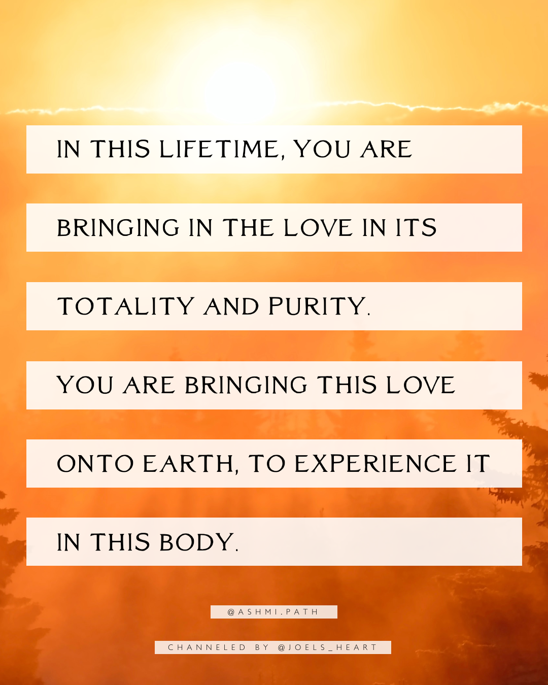 IN THIS LIFETIME, YOU ARE BRINGING IN THE LOVE IN ITS TOTALITY AND PURITY. YOU ARE BRINGING THIS LOVE ONTO EARTH. EXPERIENCING IT IN THIS BODY.