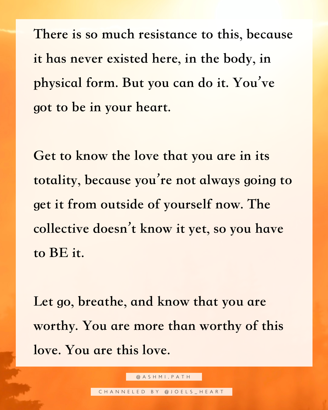 There is so much resistance to this, because it has never existed here, in the body, in physical form. But you can do it. You’ve got to be in your heart. You have to love yourself so fully, and know yourself, in the lightness of love.