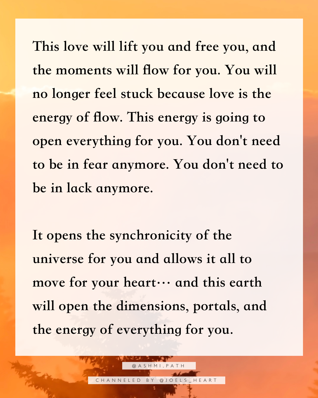 This love will lift you and free you, and the moments will flow for you. You will no longer feel stuck because love is the energy of flow. This energy is going to open everything for you. You don't need to be in fear anymore. You don't need to be in lack anymore.