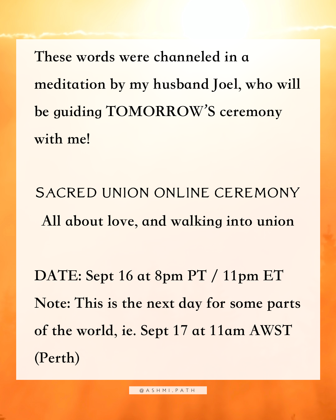 Our 2-hour special ceremony on sacred union is starting in less than 2 hours! If you're a paid member, you'll find the Zoom link and recording here: https://www.ashmipath.com/tag/monthly-ceremonies/