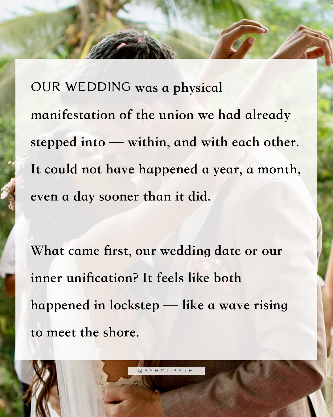 What came first, our wedding date or our inner unification? It feels like both happened in lockstep — like a wave rising to meet the shore.