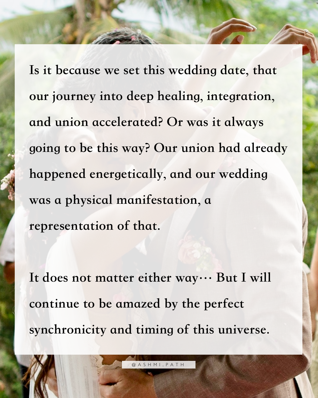 Is it because we set this wedding date, that our journey into deep healing, integration, and union accelerated? Or was it always going to be this way? Our union had already happened energetically, and our wedding was a physical manifestation, a representation of that.