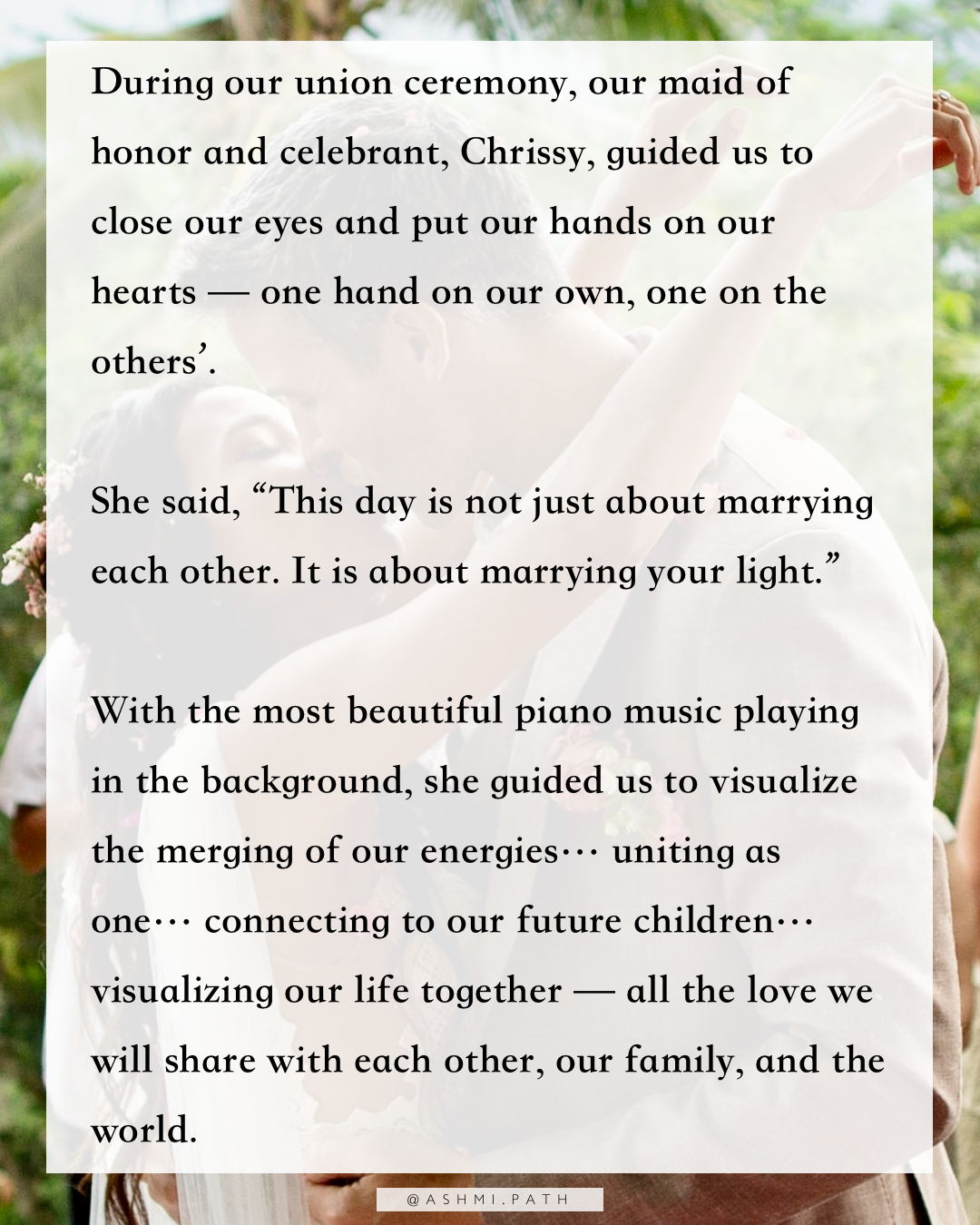 OUR WEDDING was a physical manifestation of the union we had already stepped into — within, and with each other. It could not have happened a year, a month, even a day sooner than it did.