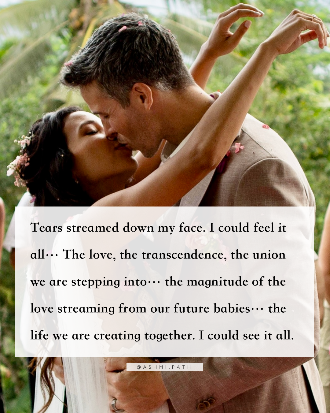 Tears streamed down my face. I could feel it all… The love, the transcendence, the union we are stepping into… the magnitude of the love streaming from our future babies… the life we are creating together. I could see it all.