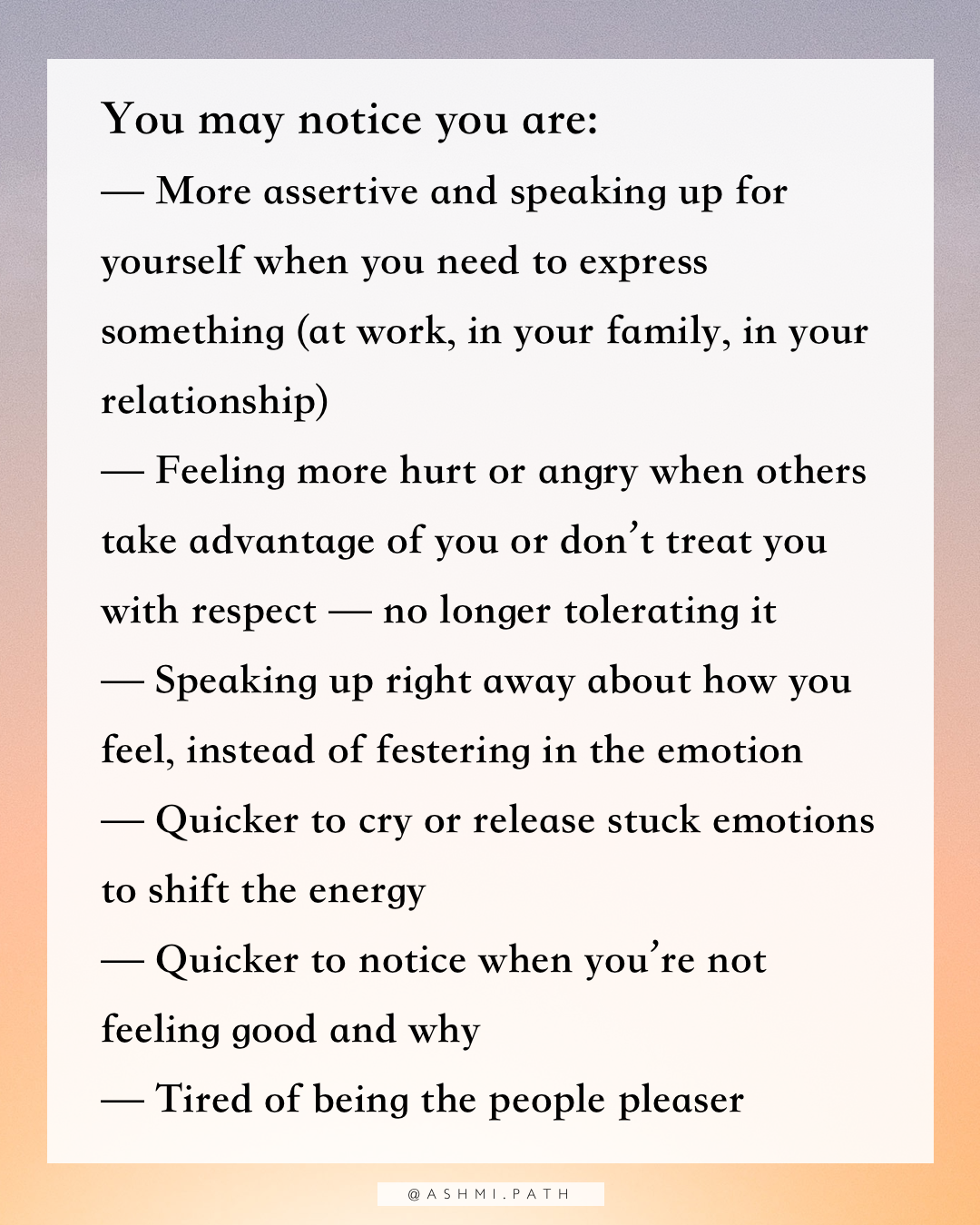 — Feeling more hurt or angry when others take advantage of you or don’t treat you with respect — no longer tolerating it