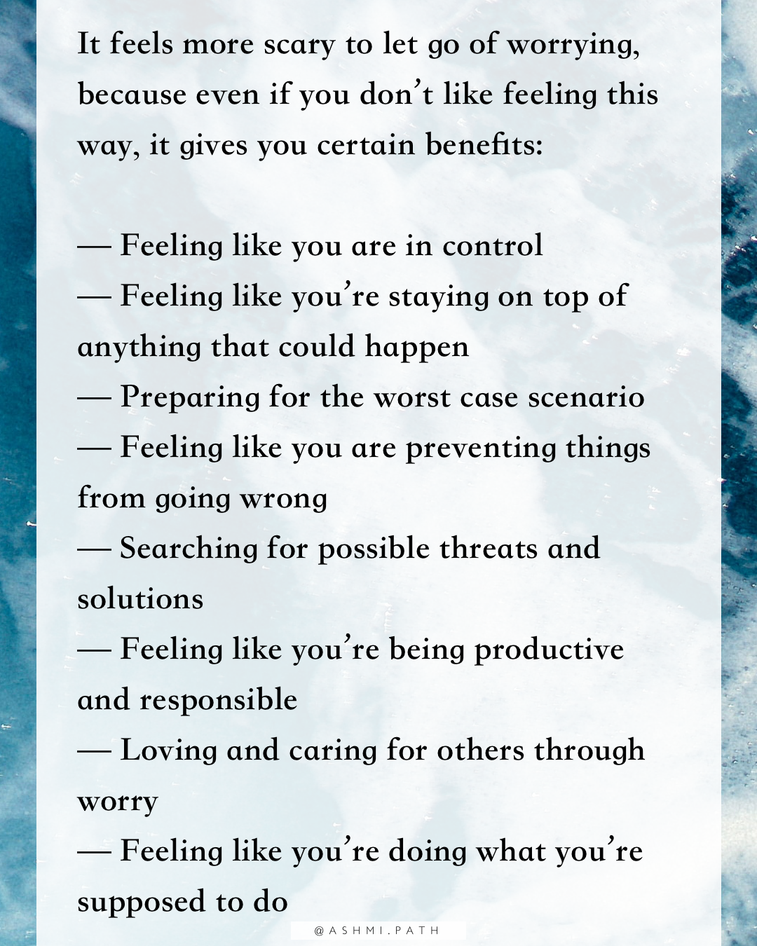 It feels more scary to let go of worrying, because even if you don’t like feeling this way, it gives you certain benefits:
