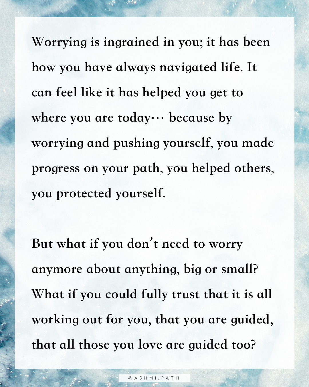 Worrying is ingrained in you; it has been how you have always navigated life. It can feel like it has helped you get to where you are today… because by worrying and pushing yourself, you made progress on your path, you helped others, you protected yourself.
