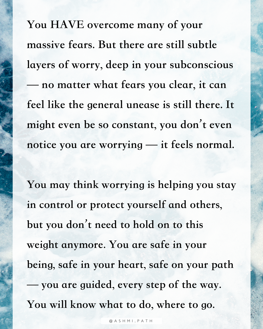 You HAVE overcome many of your massive fears. But there are still subtle layers of worry, deep in your subconscious — no matter what fears you clear, it can feel like the general unease is still there. It might even be so constant, you don’t even notice you are worrying — it feels normal.