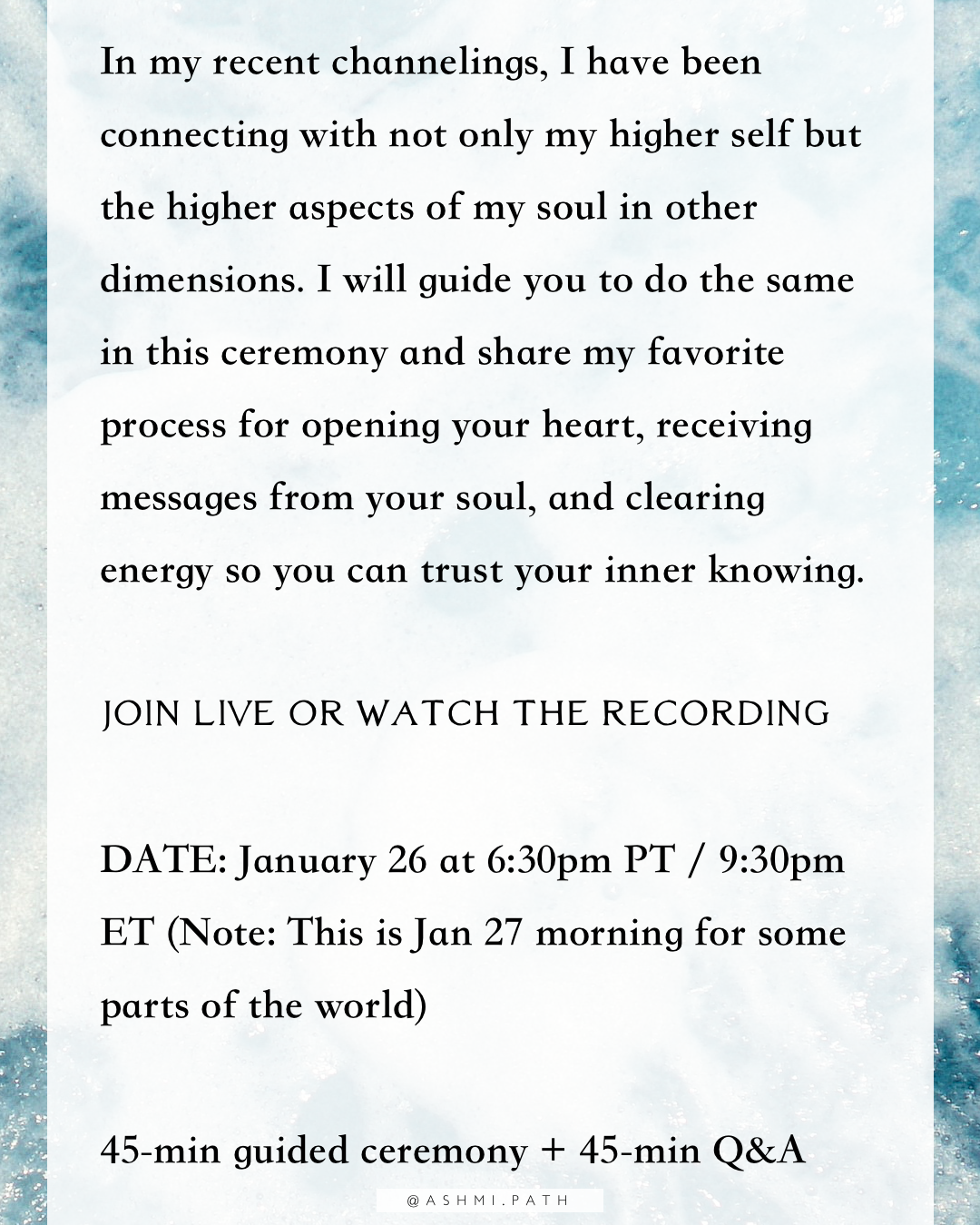 In my recent channelings, I have been connecting with not only my higher self but the higher aspects of my soul in other dimensions. I will guide you to do the same in this ceremony and share my favorite process for opening your heart, receiving messages from your soul, and clearing energy so you can trust your inner knowing.