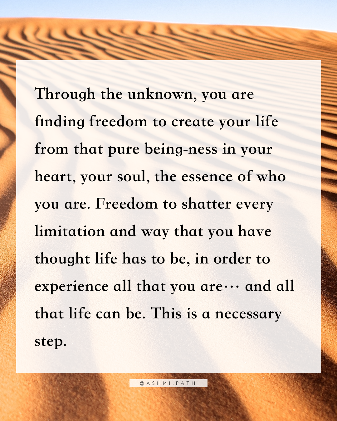 Through the unknown, you are finding freedom to create your life from that pure being-ness in your heart, your soul, the essence of who you are. Freedom to shatter every limitation and way that you have thought life has to be, in order to experience all that you are… and all that life can be. This is a necessary step.