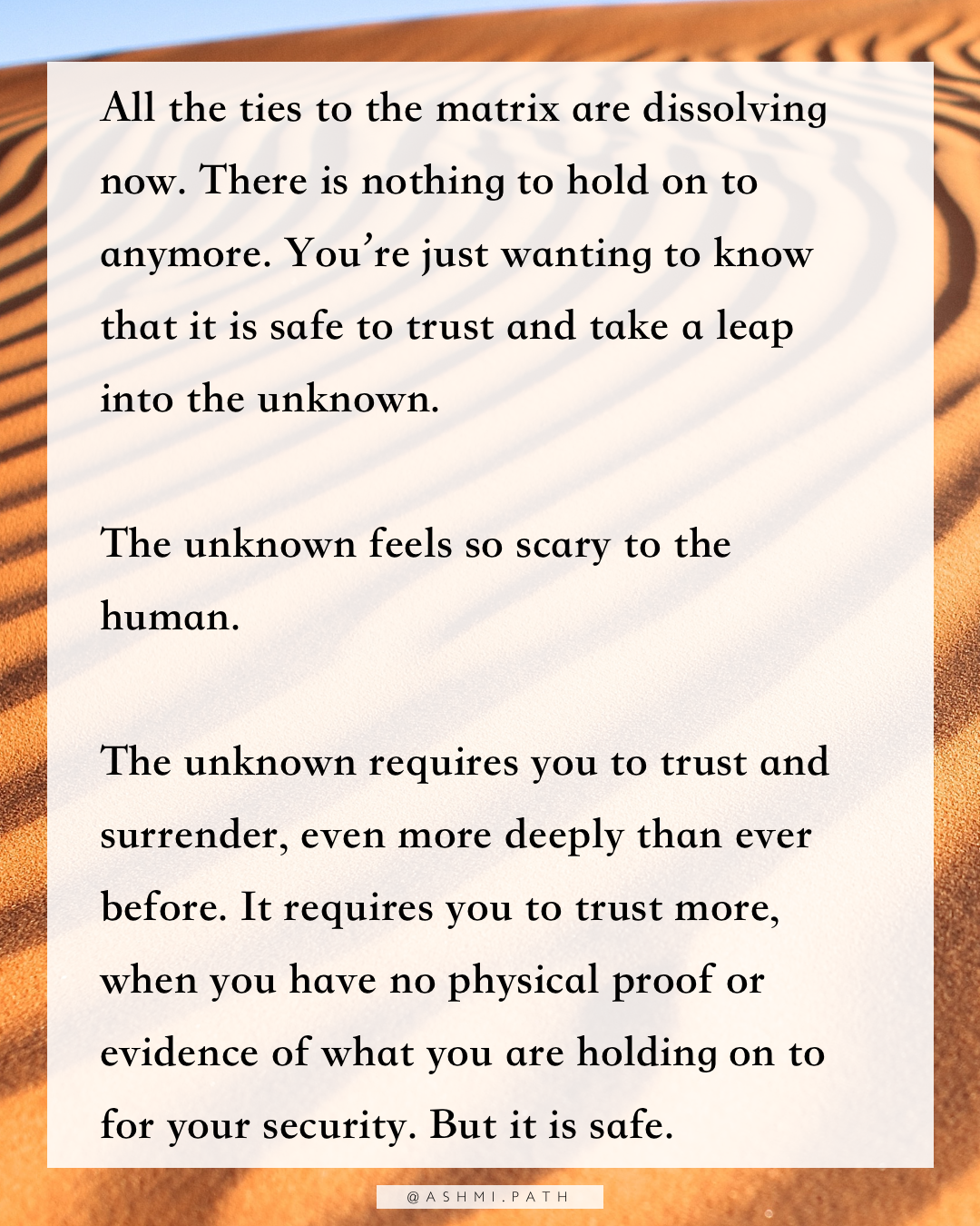The unknown requires you to trust and surrender, even more deeply than ever before. It requires you to trust more, when you have no physical proof or evidence of what you are holding on to for your security. But it is safe.