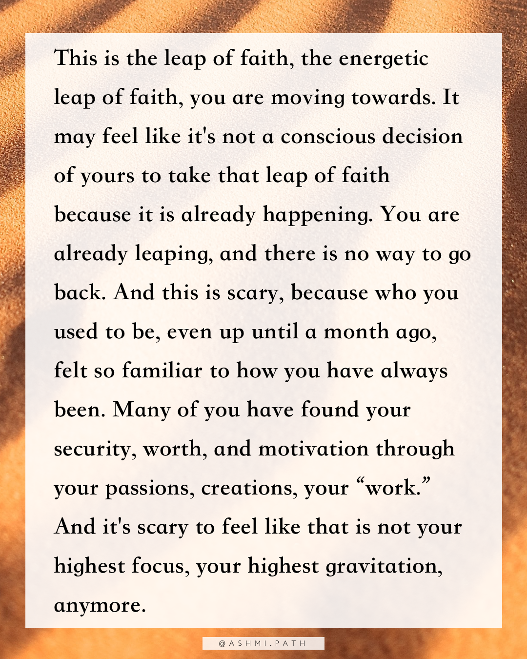 This is the leap of faith, the energetic leap of faith, you are moving towards. It may feel like it's not a conscious decision of yours to take that leap of faith because it is already happening. You are already leaping, and there is no way to go back. And this is scary, because who you used to be, even up until a month ago, felt so familiar to how you have always been. Many of you have found your security, worth, and motivation through your passions, creations, your “work.” And it's scary to feel like that is not your highest focus, your highest gravitation, anymore.