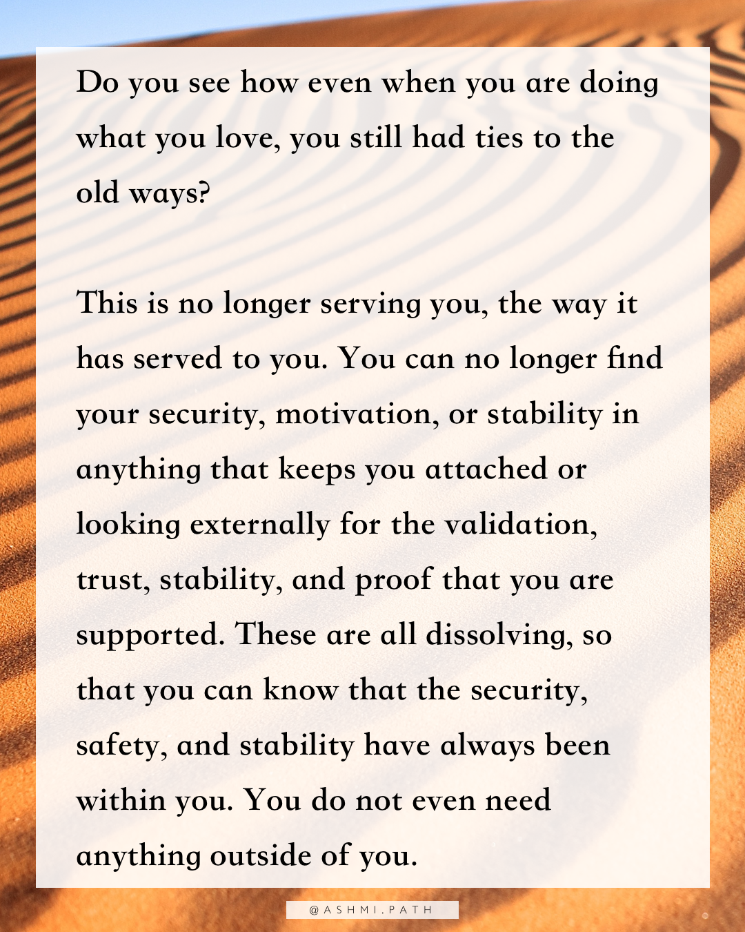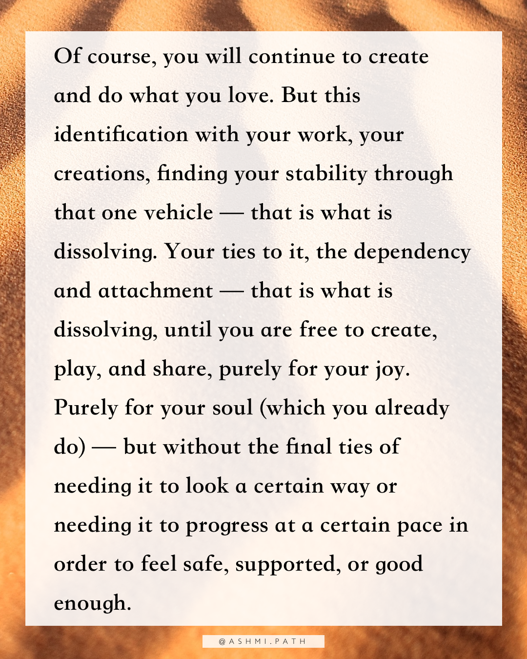 Of course, you will continue to create and do what you love. But this identification with your work, your creations, finding your stability through that one vehicle — that is what is dissolving. Your ties to it, the dependency and attachment — that is what is dissolving, until you are free to create, play, and share, purely for your joy. Purely for your soul (which you already do) — but without the final ties of needing it to look a certain way or needing it to progress at a certain pace in order to feel safe, supported, or good enough.