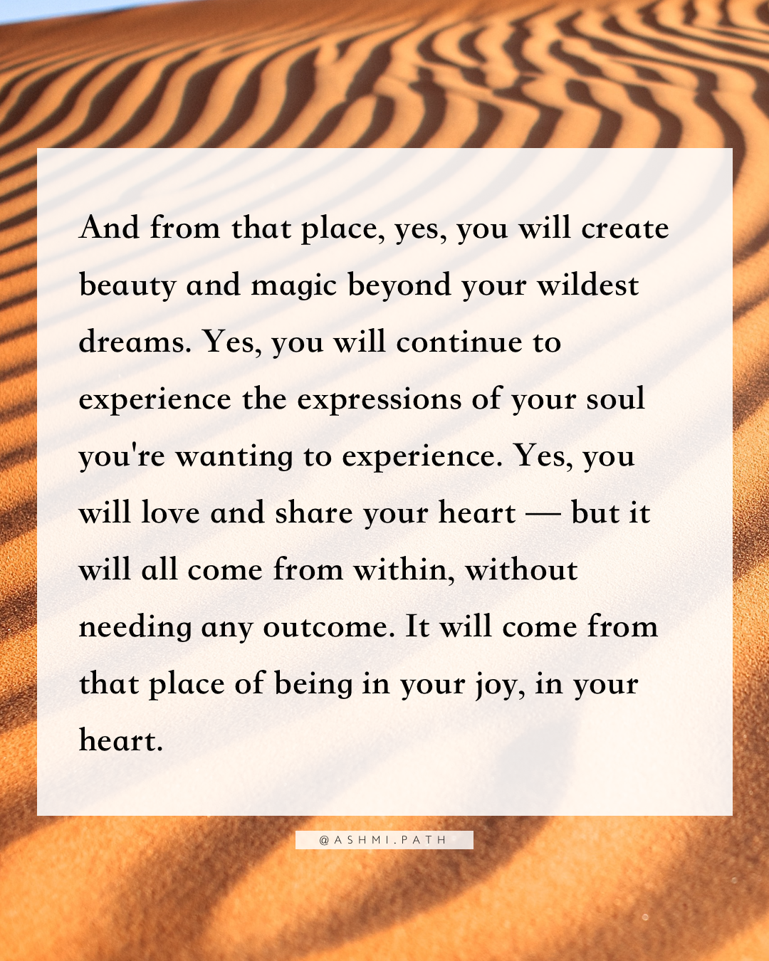 And from that place, yes, you will create beauty and magic beyond your wildest dreams. Yes, you will continue to experience the expressions of your soul you're wanting to experience. Yes, you will love and share your heart — but it will all come from within, without needing any outcome. It will come from that place of being in your joy, in your heart.