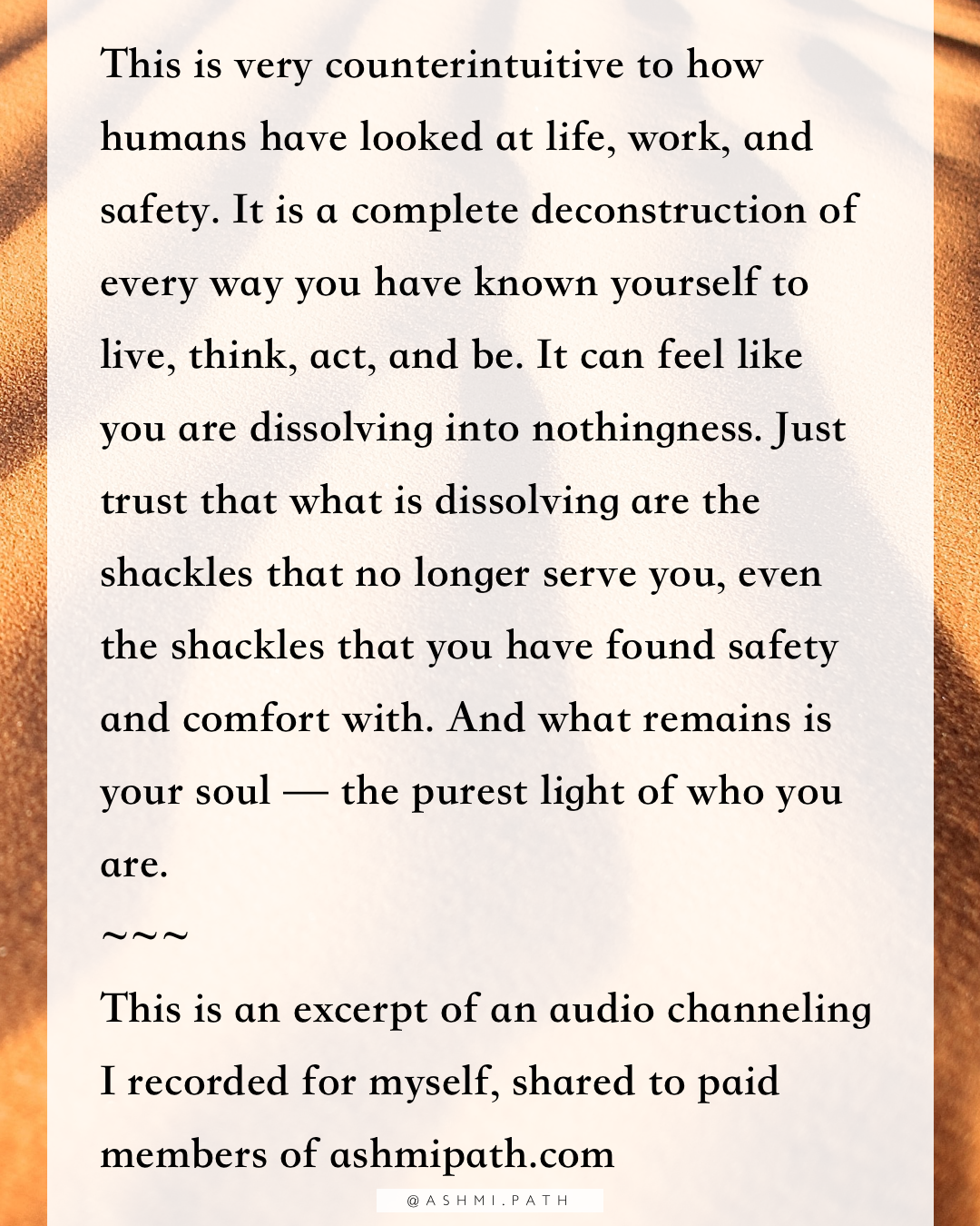 This is very counterintuitive to how humans have looked at life, work, and safety. It is a complete deconstruction of every way you have known yourself to live, think, act, and be. It can feel like you are dissolving into nothingness. Just trust that what is dissolving are the shackles that no longer serve you, even the shackles that you have found safety and comfort with. And what remains is your soul — the purest light of who you are.