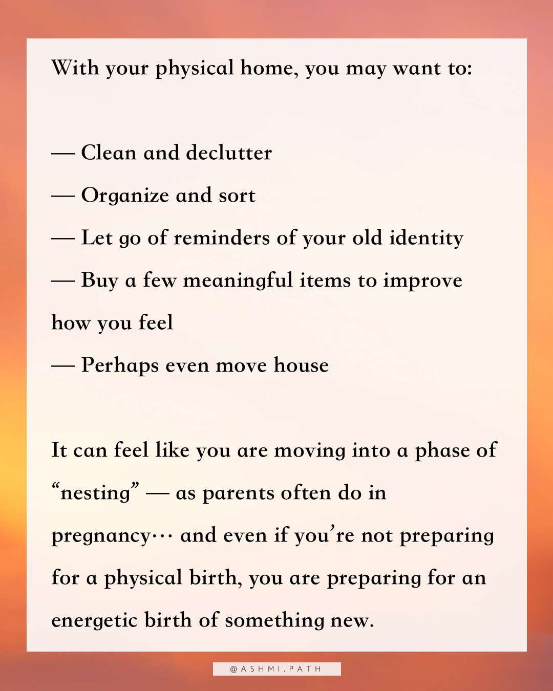 It can feel like you are moving into a phase of “nesting” — as parents often do in pregnancy… and even if you’re not preparing for a physical birth, you are preparing for an energetic birth of something new.