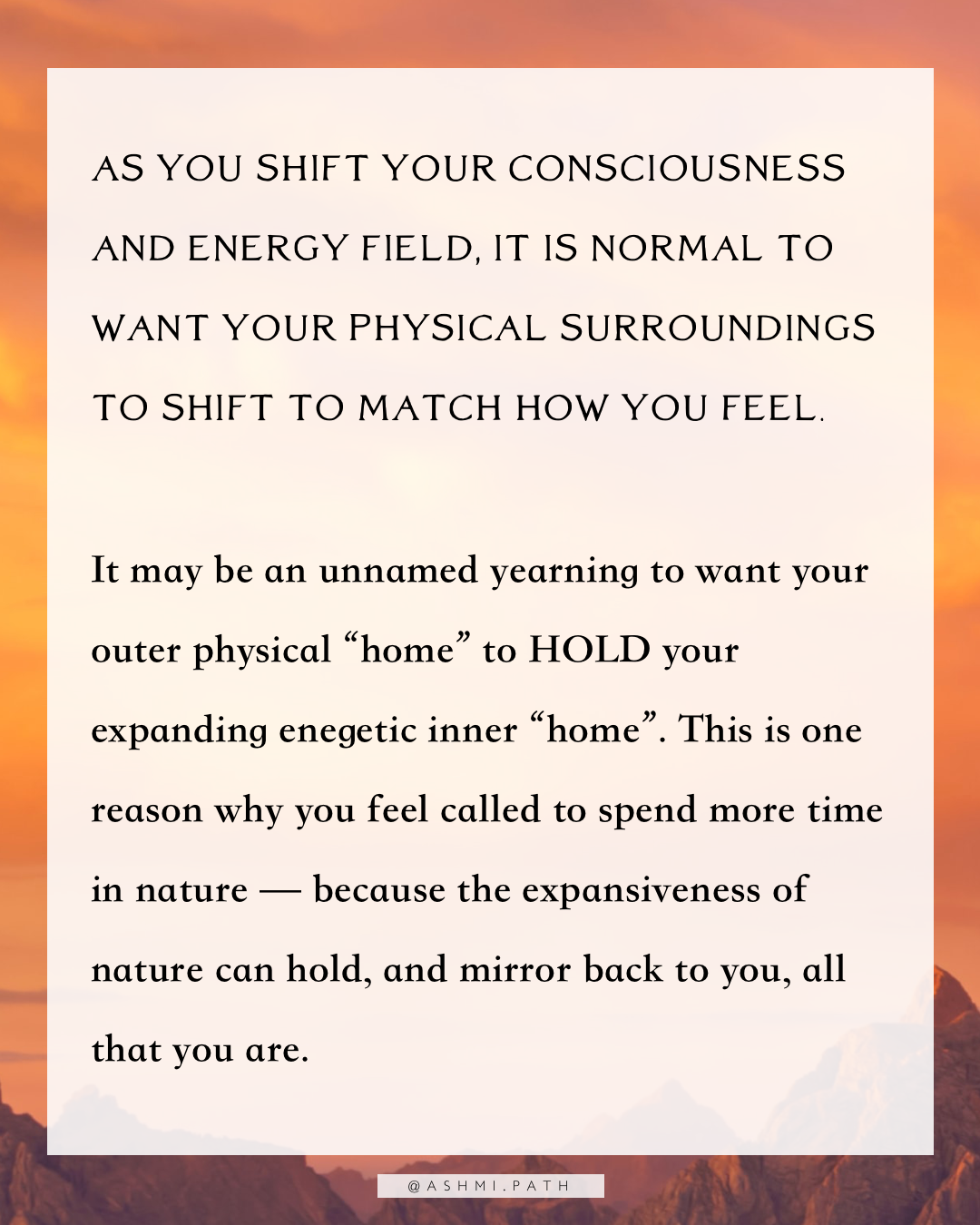 It may be an unnamed yearning to want your outer physical “home” to HOLD your expanding energetic inner “home”. This is one reason why you feel called to spend more time in nature — because the expansiveness of nature can hold, and mirror back to you, all that you are.